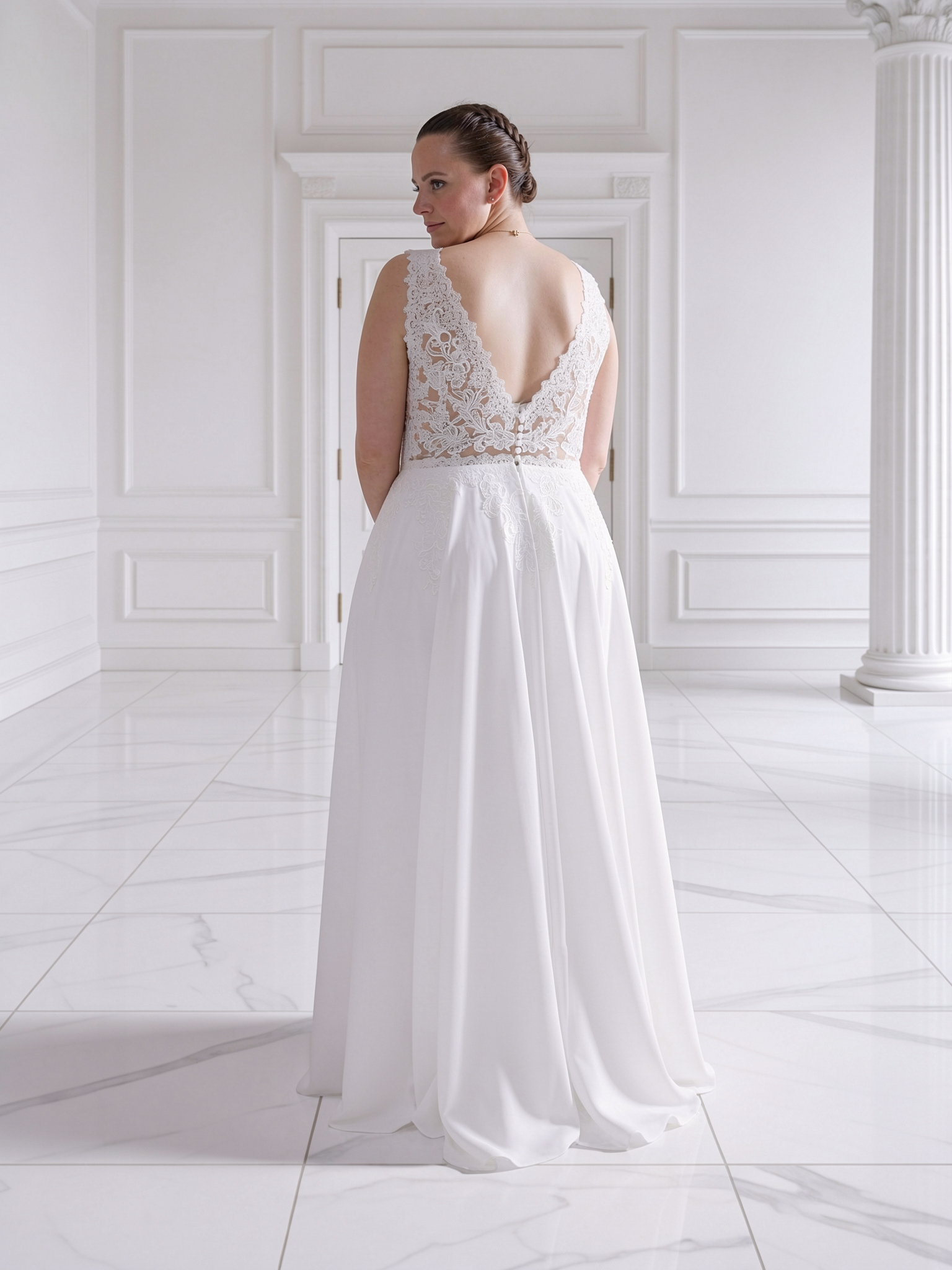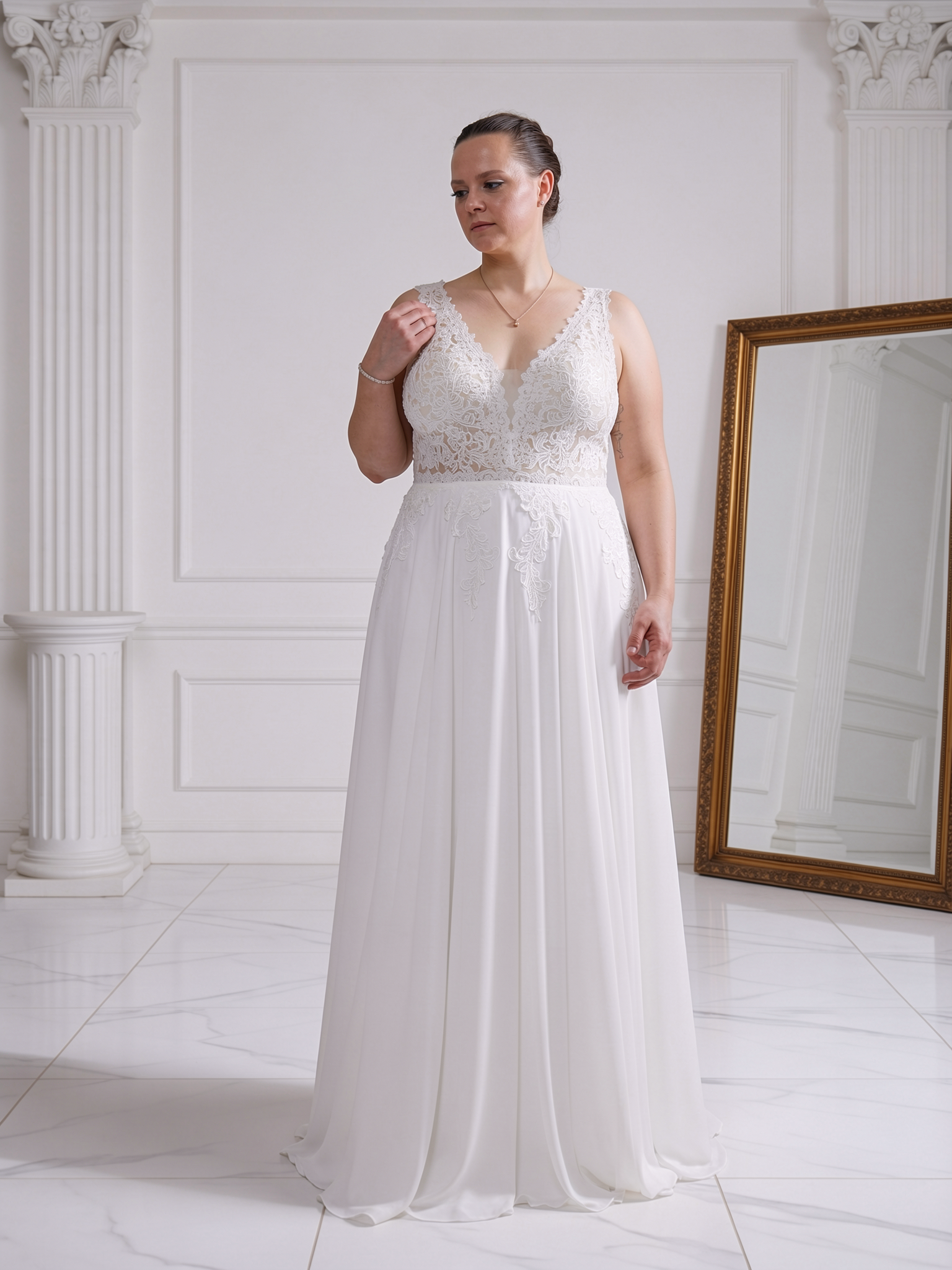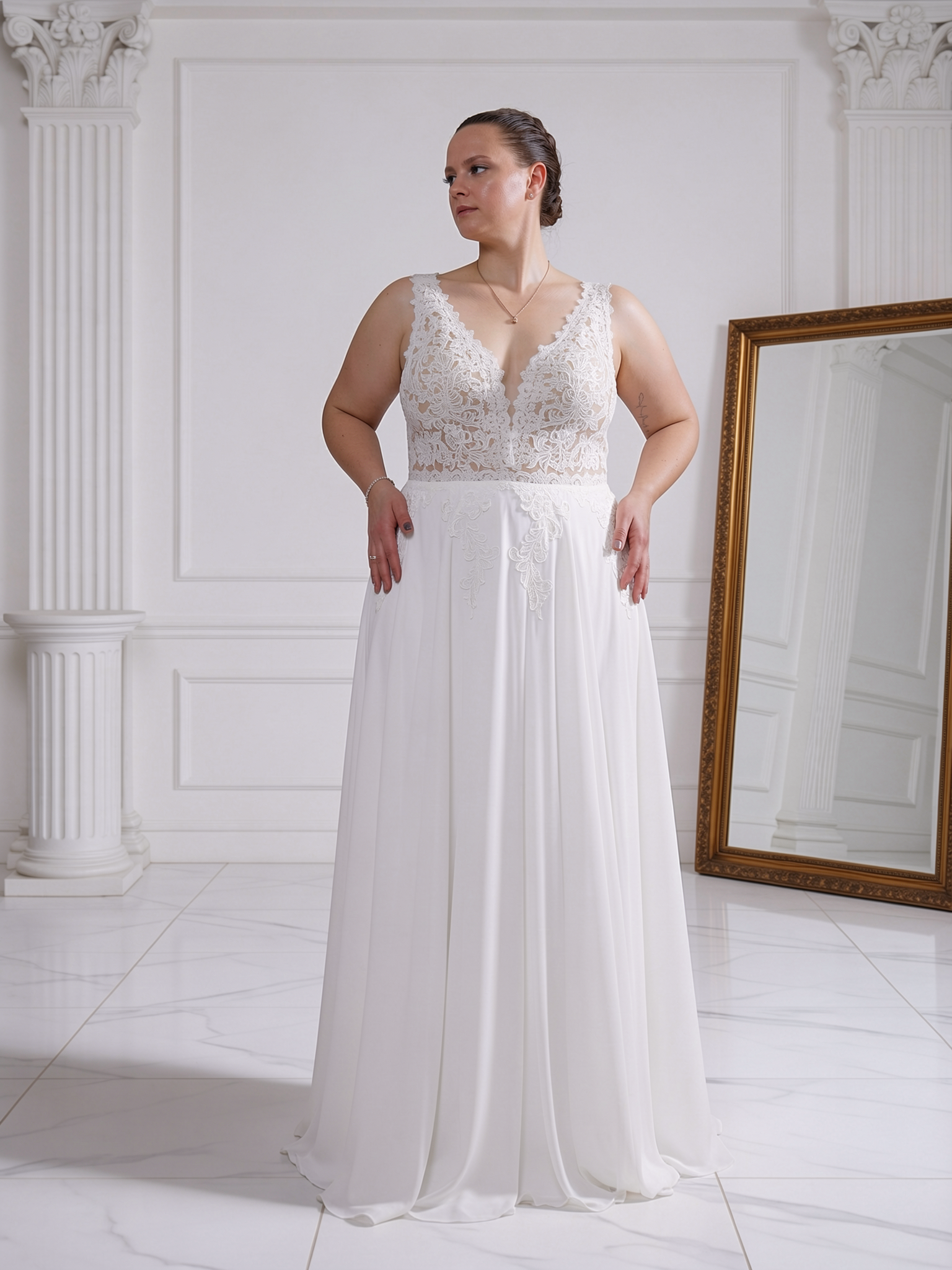 Moderne Brautkleider in großer Größe. Bei uns ist alles möglich – ob kurzes oder langes, mit Spitze verziert oder in schlichtem Elegant: Keine Wünsche bleiben offen! Wir würden Dir helfen, das Perfekt und günstige XXL-Hochzeitskleid für Deinen schönsten Tag zu finden. Lass Dich von unserer Designerin beraten und finde das Kleid dein Brautkleid