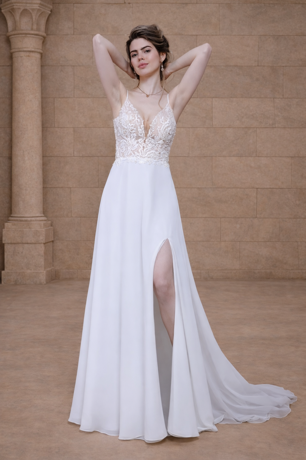 Die A-Linien-Silhouette macht dieses Kleid besonders vielseitig, da sie vielen Figurtypen schmeichelt und eine elegante Balance zwischen Komfort und stilvoller Erscheinung bietet. Der leichte Chiffonstoff sorgt für einen fließenden Fall des Rocks und verleiht dem Brautlook eine natürliche Leichtigkeit.