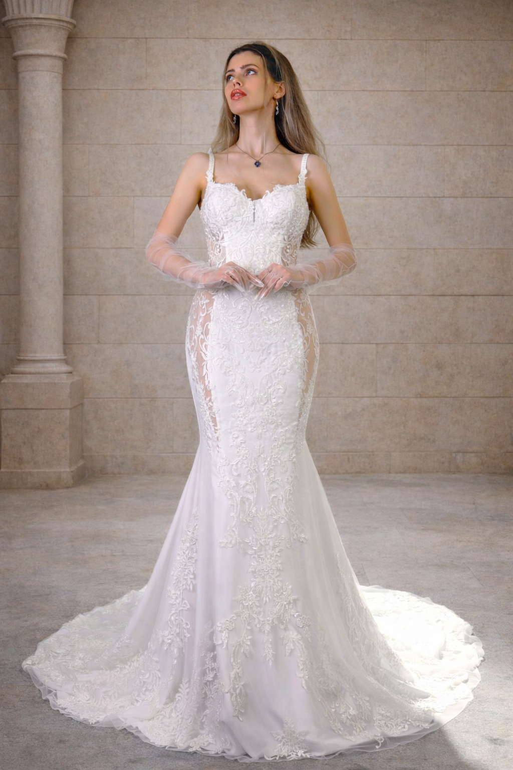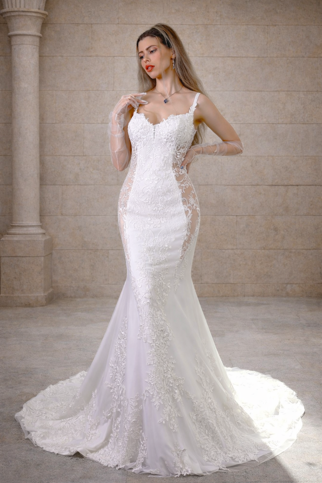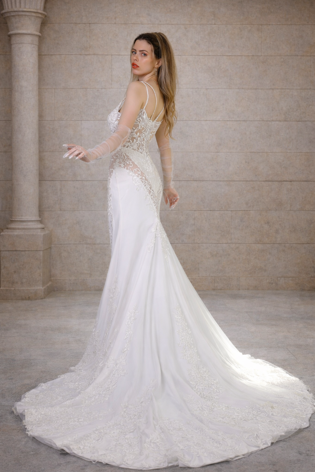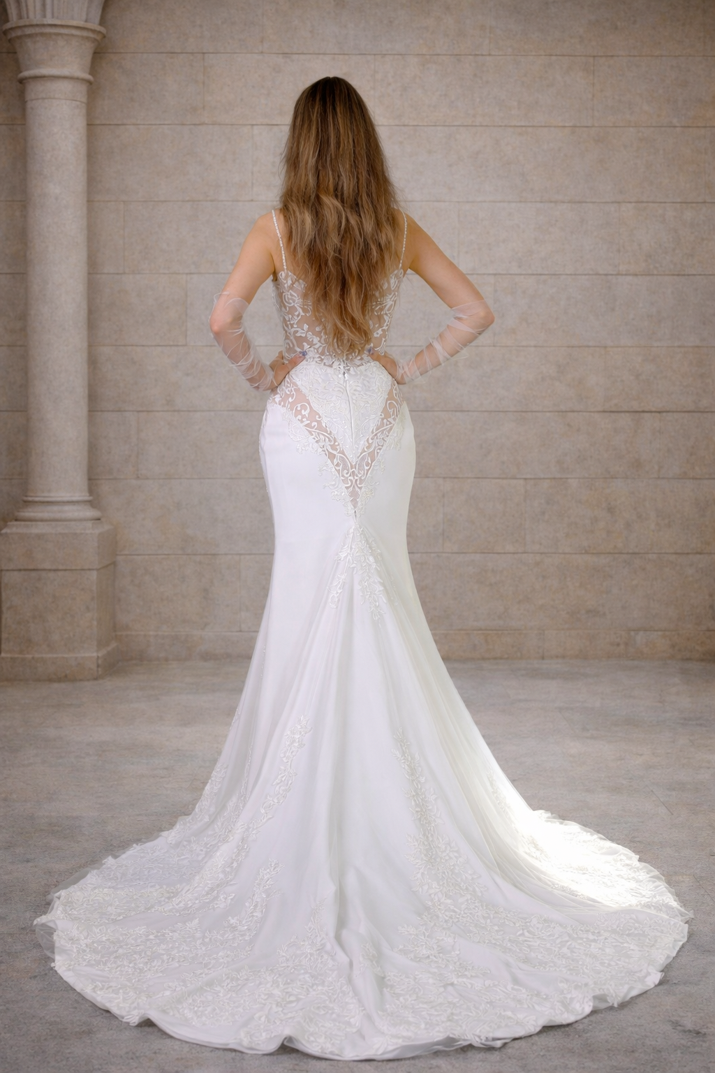 Der lange Rock mit romantischer Schleppe sorgt für einen beeindruckenden Auftritt beim Gang zum Altar. Durch die figurbetonte Passform wirkt das Kleid besonders feminin und elegant. Dieses Brautkleid eignet sich ideal für klassische Hochzeiten, romantische Zeremonien oder elegante Destination Weddings.