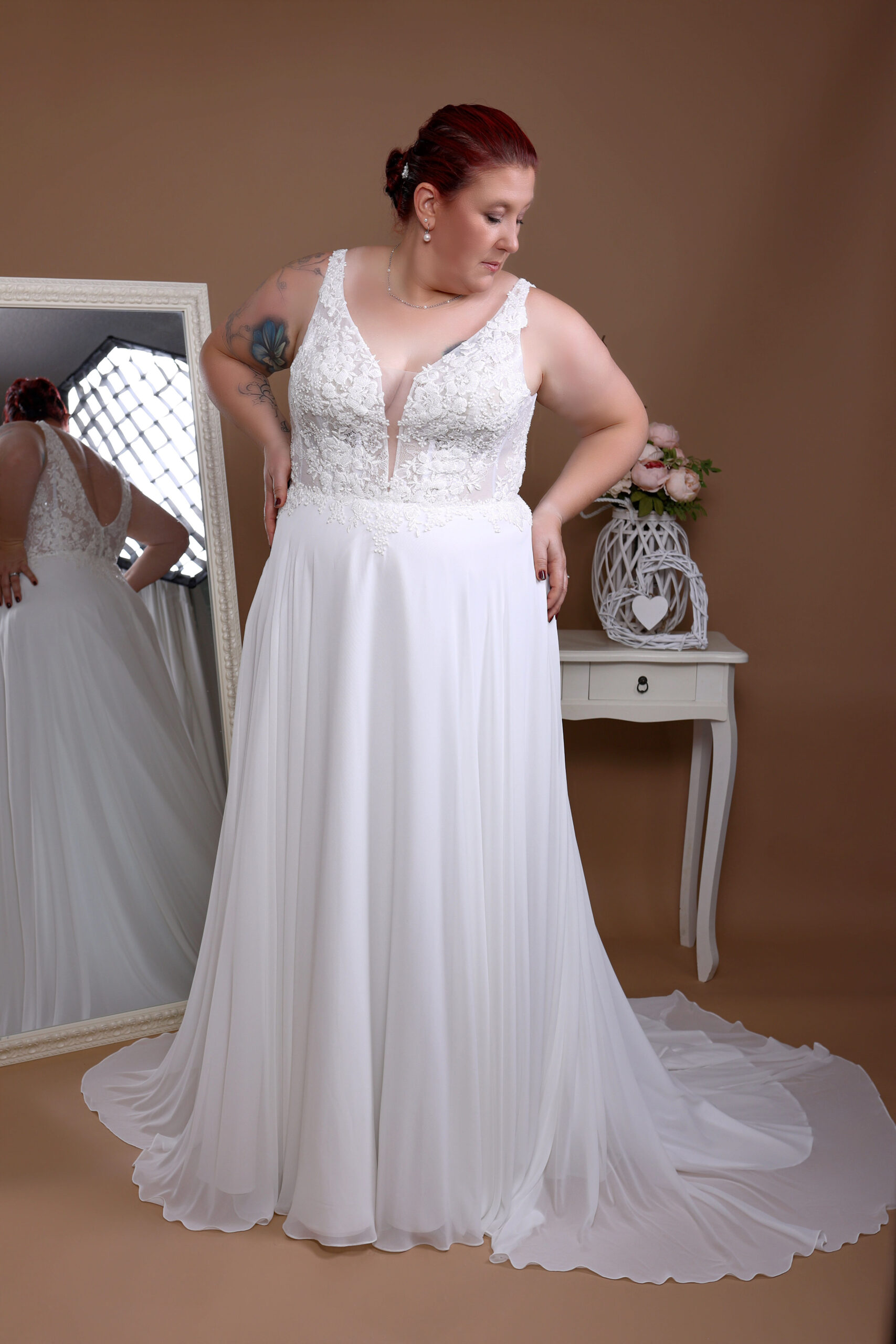 Moderne Brautkleider in großer Größe. Bei uns ist alles möglich – ob kurzes oder langes, mit Spitze verziert oder in schlichtem Elegant: Keine Wünsche bleiben offen! Wir würden Dir helfen, das Perfekt und günstige XXL-Hochzeitskleid für Deinen schönsten Tag zu finden. Lass Dich von unserer Designerin beraten und finde das Kleid dein Brautkleid
