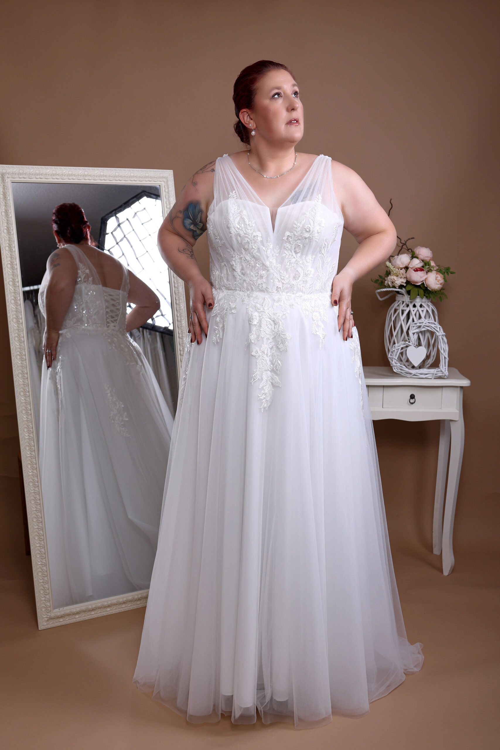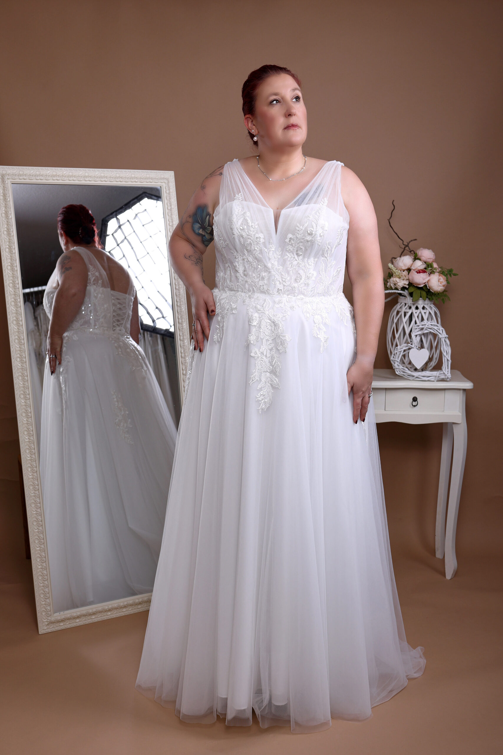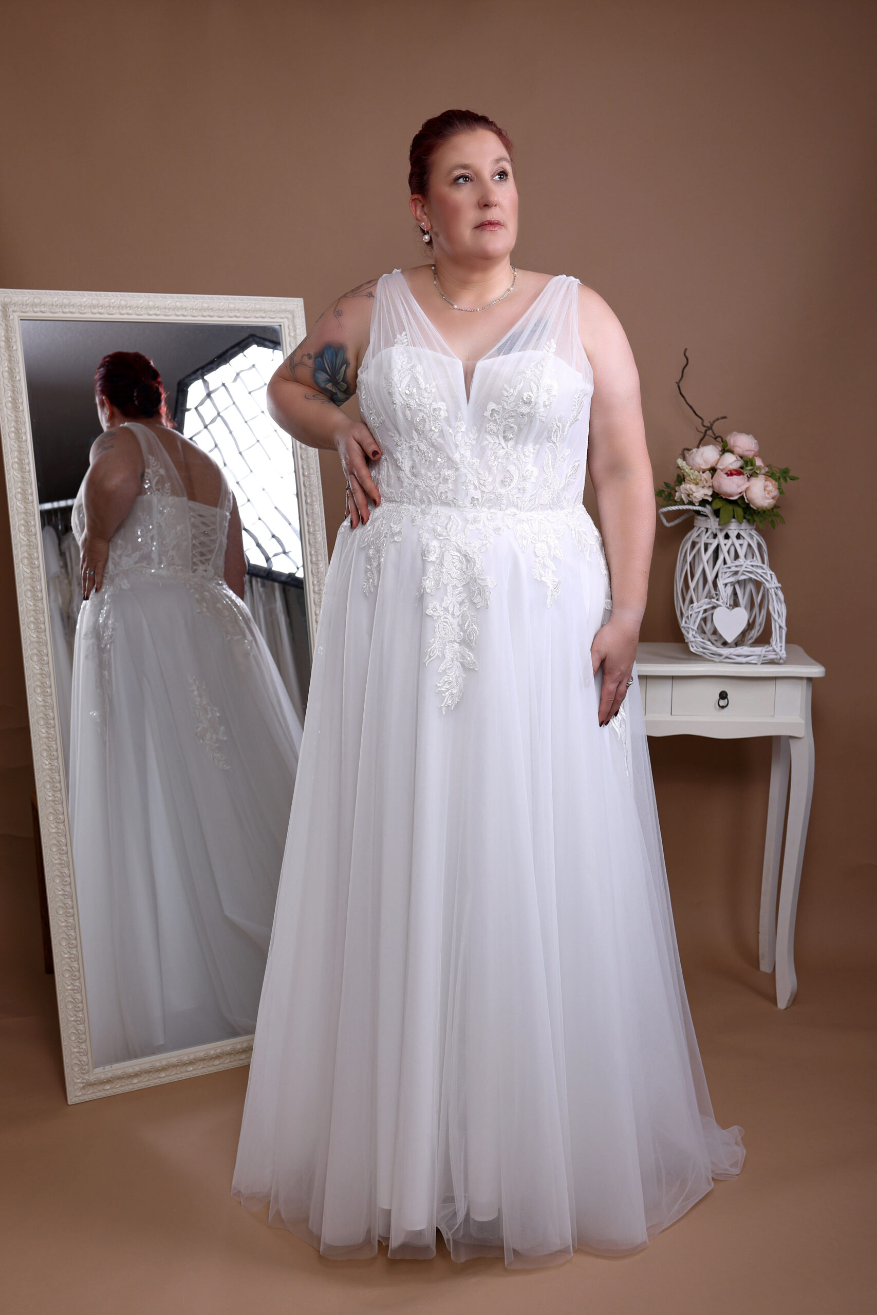 Moderne Brautkleider in großer Größe. Bei uns ist alles möglich – ob kurzes oder langes, mit Spitze verziert oder in schlichtem Elegant: Keine Wünsche bleiben offen! Wir würden Dir helfen, das Perfekt und günstige XXL-Hochzeitskleid für Deinen schönsten Tag zu finden. Lass Dich von unserer Designerin beraten und finde das Kleid dein Brautkleid